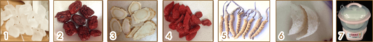 1)冰糖 2)红枣 3) 泡参 4) 梞子 5)冬虫草 6)干燕窝 7)炖盅